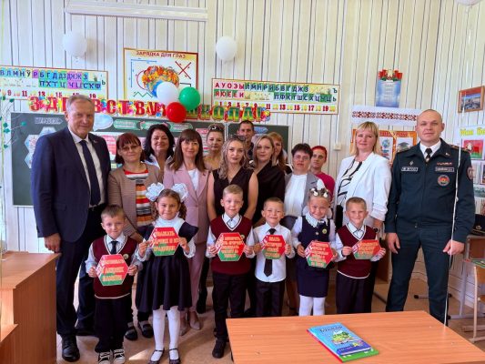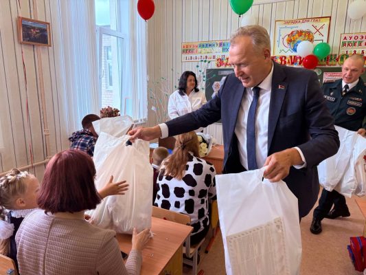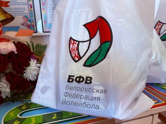 Первоклассникам Владимир Александрович передал подарки: книги “Беларусь – наша Радзіма”, а также яркие укомплектованные пакеты от федерации волейбола.