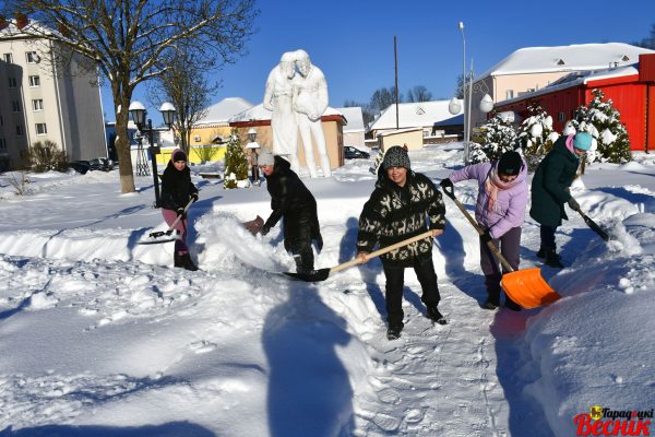 Свои «снежные» бригады отправили на расчистку тротуаров райцентра, детских площадок самые разные предприятия и учреждения. Инициативу поддержала и молодежь. Возглавила вооруженный лопатами трудовой десант председатель райисполкома Ирина Полякова.