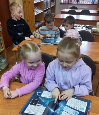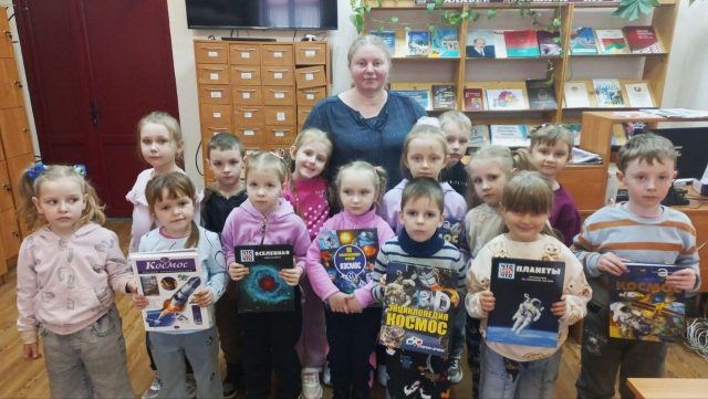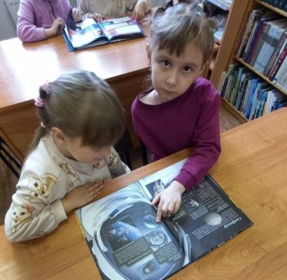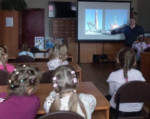 Мальчишки и девчонки с радостью делились тем, что они сами знают о космосе. Затем детям был показан видеофильм о старте космического корабля с первым космонавтом планеты Юрием Гагариным. Также от библиотекаря ребята узнали о книгах, рассказывающих о Вселенной, планетах, звездах, галактиках и кометах.